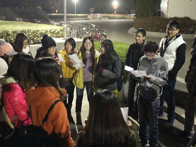 之后的两周,九班有组织地开展了学班歌、唱班歌、演班歌的活动。为了迎接班级风采大赛的到来,同学们不遗余力地在短短12天中进行了5次合唱排练。每个人的参与热情都十分高涨。其中几次要排练到22:00甚至更晚,但没有可以使用的教室,同学们毫不犹豫地选择在露天的下沉广场冒着严寒排练——十二月初的两个夜晚,启真湖上的寒风记住了九班的歌声。