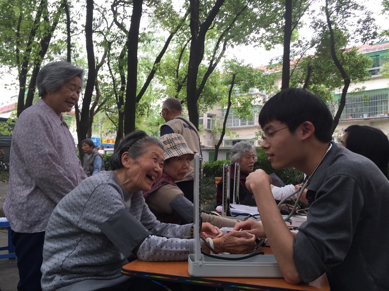 本次活动的志愿者分作两支小队。第一队志愿者向社区工作人员劳姐姐借了三张方桌,十来个凳子,拉起横幅,在社区的林间活动区架起了场子,就开始热情地招呼周围的老人们。3位志愿者准备好血压计、听诊器,专注地给爷爷奶奶们测量血压,其他志愿者则热情地和爷爷奶奶们拉家常,谈保健知识,尝试着用他们的知识带给老人们帮助和温暖。