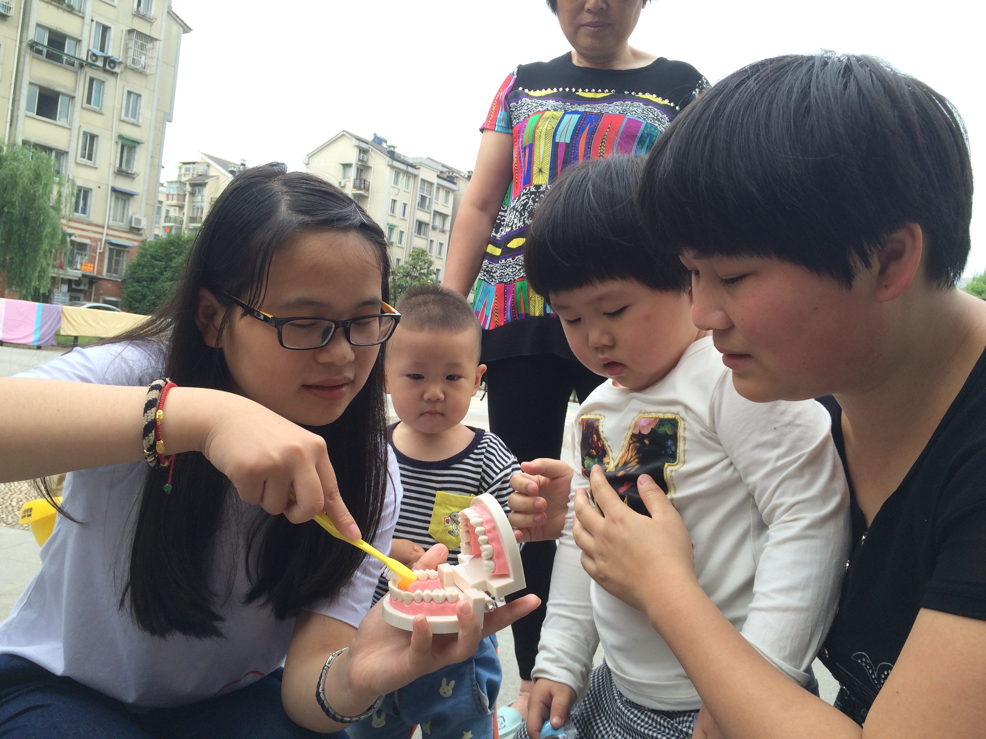 刚摆好桌子,拿出牙齿模型,就有不少在附近纳凉聊天的居民围了上来,我们说明来意后,他们都非常感兴趣。负责知识讲授的同学开始讲解常见的口腔疾病及预防、bass刷牙法及常见的误区。面对面的讲解十分生动,居民也积极地提出问题与我们进行沟通交流,我们也就自己所学为他们进行解惑。比如,为什么在洗牙过程中会有牙齿酸痛、感觉牙缝变宽的情况出现等等。负责bass刷牙法展示的同学也与居民们展开互动。我们先向居民说明bass刷牙法的要领,并在模型上进行展示,并让他们现场在模型上练习,指出其错误的地方。现场还有许多小朋友,他们也有相当大的兴趣。教授他们正确的口腔护理知识,对小朋友一生都有重大的意义,也让我们感觉十分开心。我们还贴心地给观众送上牙刷、牙膏、牙线棒等小礼品,希望他们能更加关注自身口腔健康。